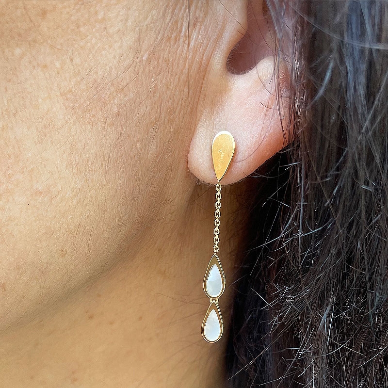Pendientes largos con movimiento compuestos por 3 motivos en forma de gota. Realizados en oro amarillo de primera ley y nácar. Cierre de presión